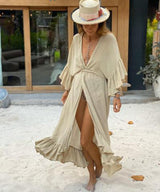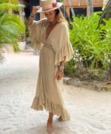Long kaftan made of cotton gauze with ruffles on the sleeves and skirt with which we managed to give a lot of flight making you feel as if you were dancing to the beat of the wind. 3/4 sleeves and adjustment tape at the waist.